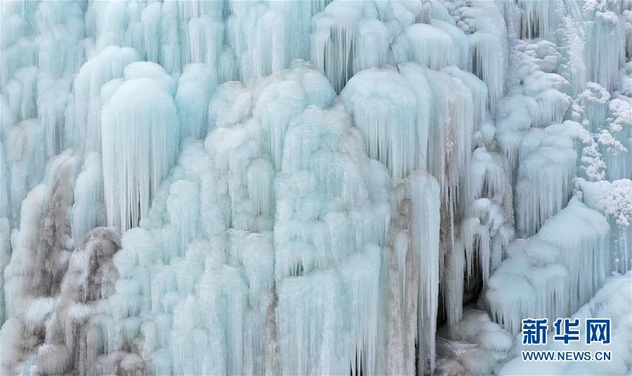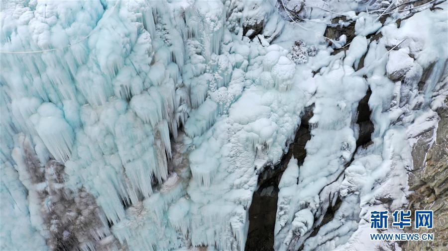这是1月7日拍摄的贺兰山岩画景区内的冰瀑景观(无人机照片)。 近日,宁夏贺兰山岩画景区内,自然山泉冻结冰瀑和人造冰瀑景观相结合,形成多处冰瀑景观,山间形态各异的冰挂、冰柱鬼斧神工,蔚为壮观,吸引众多游客前来观赏。 新华社记者 王鹏 摄