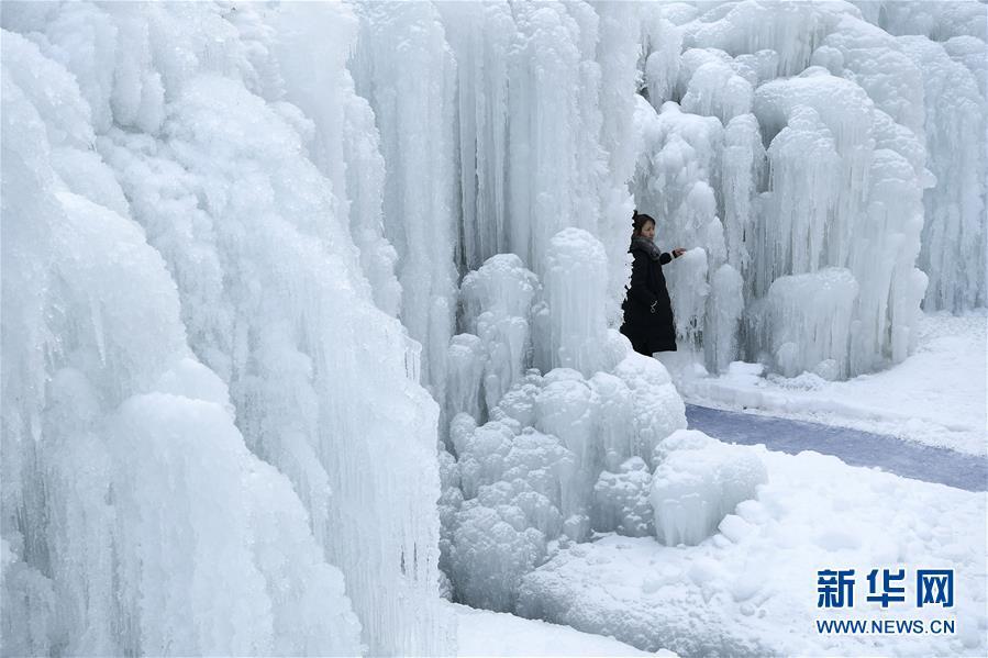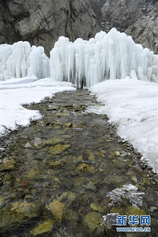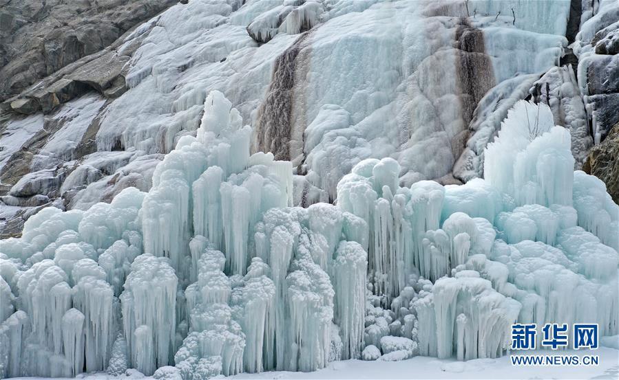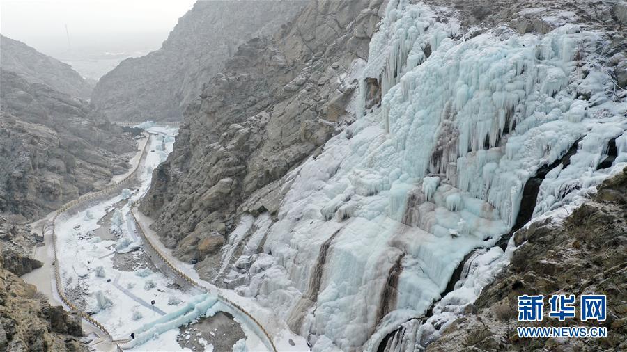 这是1月7日拍摄的贺兰山岩画景区内的冰瀑景观。 近日,宁夏贺兰山岩画景区内,自然山泉冻结冰瀑和人造冰瀑景观相结合,形成多处冰瀑景观,山间形态各异的冰挂、冰柱鬼斧神工,蔚为壮观,吸引众多游客前来观赏。 新华社记者 王鹏 摄