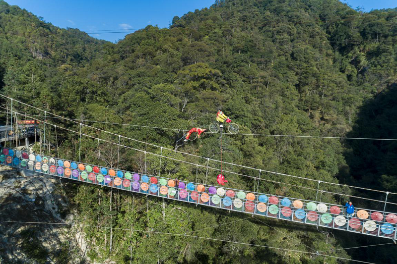 1月16日,湖南省汝城县九龙江国家森林公园“九龙江高空特技节”精彩上演,特技演员在钢丝上表演各种高难度动作,引发游客阵阵惊呼。