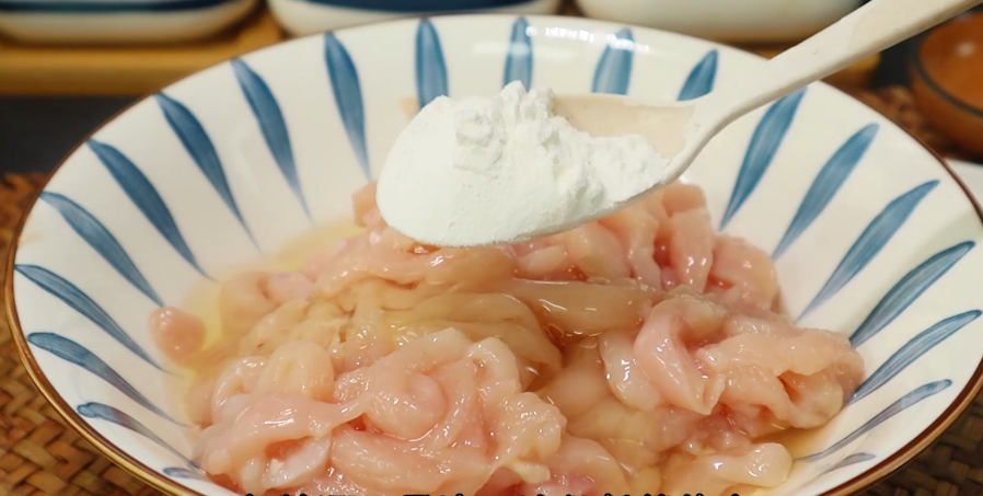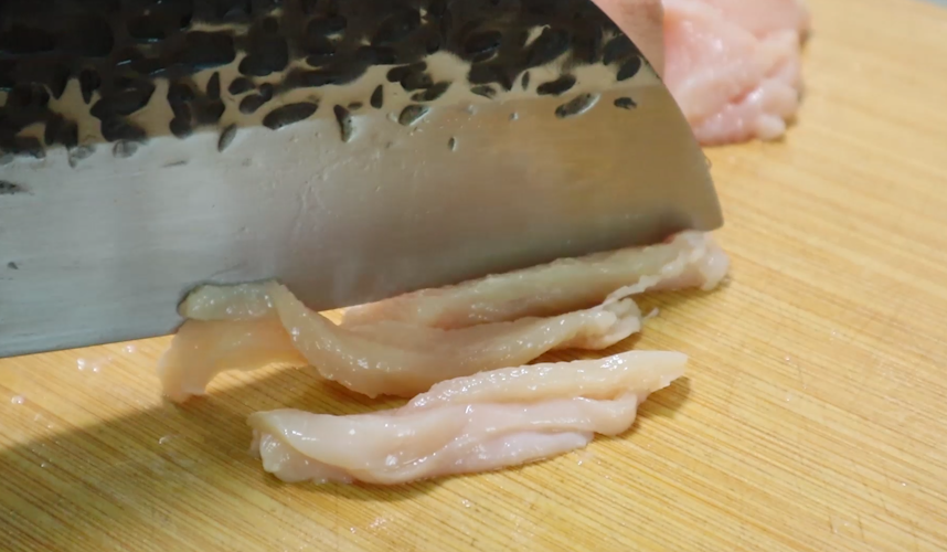 第一步、鸡胸肉切成厚厚的薄片,用里脊肉也可以,但是我觉得鸡胸肉的口感更加的鲜嫩,然后再把它切成细丝,切好装入碗中。
