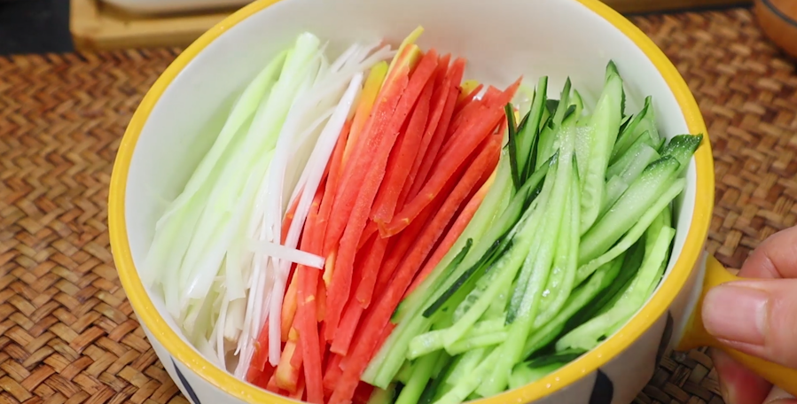 第三步、胡萝卜丝、葱白切葱丝、黄瓜切丝。