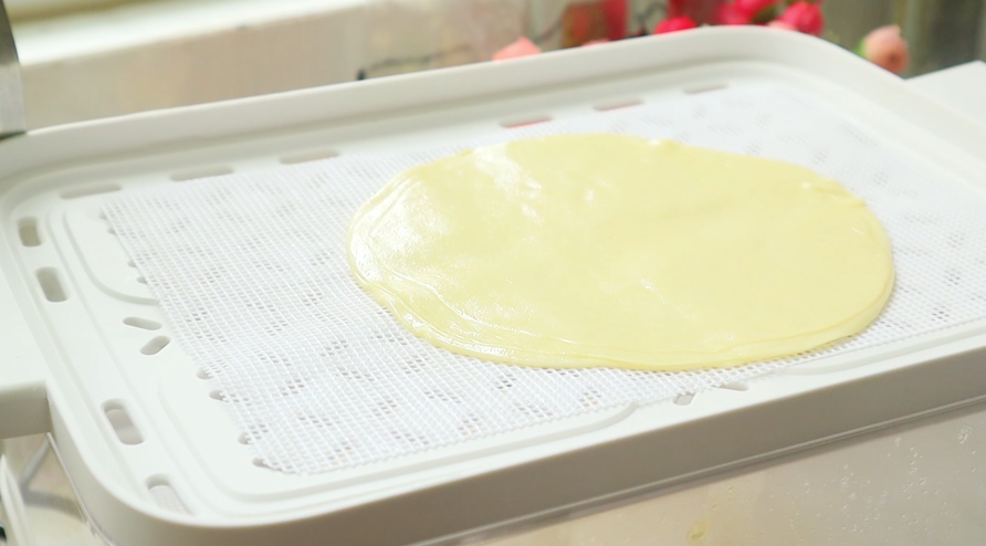 第四步、饺子皮放到案板上,表面刷上食用油,然后再叠上一张,差不多反复叠个7、8张就可以了,然后把饺子皮擀薄、擀圆,蒸锅上汽后,大火蒸上10分钟。