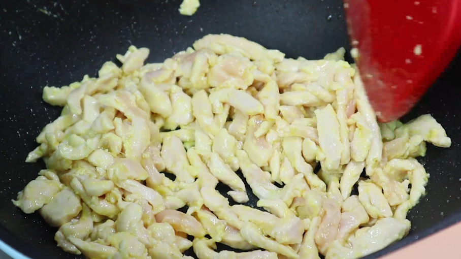 第六步、锅里油热后,倒入腌好的鸡胸肉,大火翻炒至变色,炒好后盛出备用。