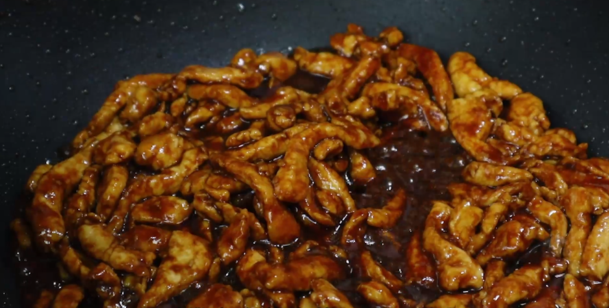 第七步、锅里留点油,放甜面酱炒出香味,加入适量的清水、然后蚝油、生抽、酱油、白糖、水淀粉,把料汁炒至黏稠,倒入肉丝大火翻炒。
