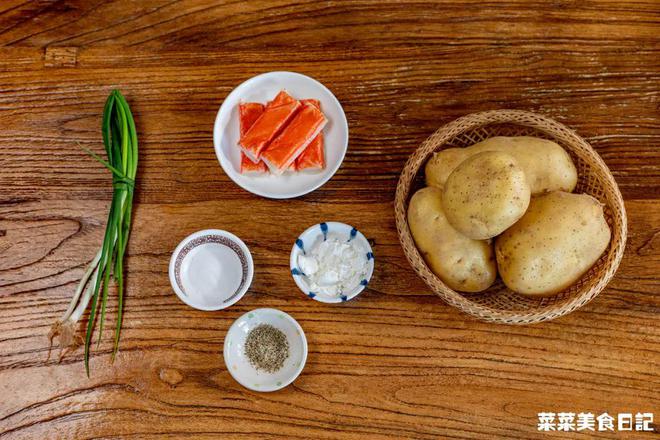 土豆1颗 淀粉1大勺 黑胡椒1小勺 盐1小勺 蟹柳2-3根 小葱1根