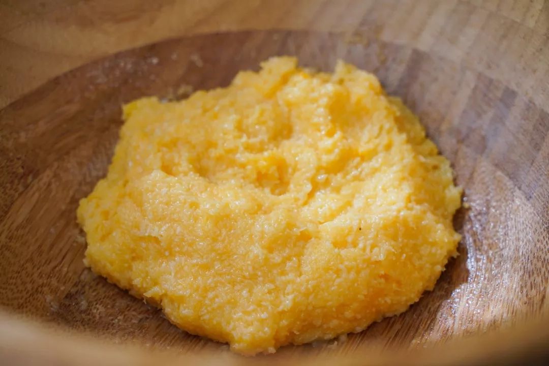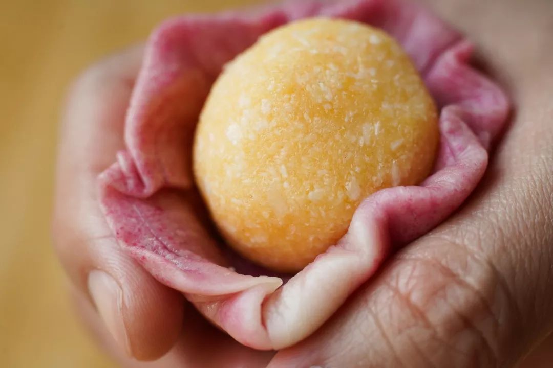 1、50g无盐黄油小火隔水融化,加入30g全脂奶粉、60g糖粉、50g鸡蛋液和100g椰蓉,混合成团,做成椰香馅心。
