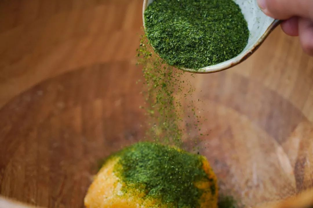 2、椰香馅心均分成两份,取一份,加入7g海苔粉混匀,海苔椰香馅心完成。