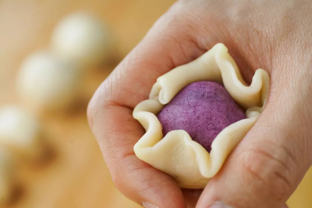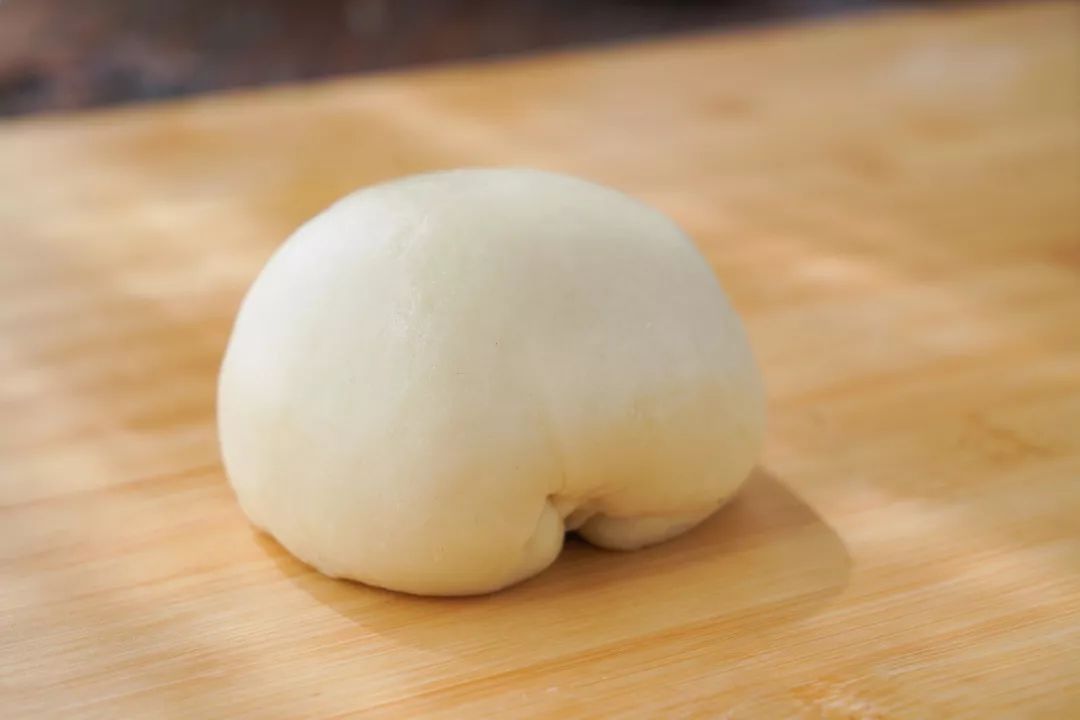 1、 面团用手掌压平,擀成圆形,包入馅心,收口搓圆,收口朝下(收口注意要收紧,以免露馅)。