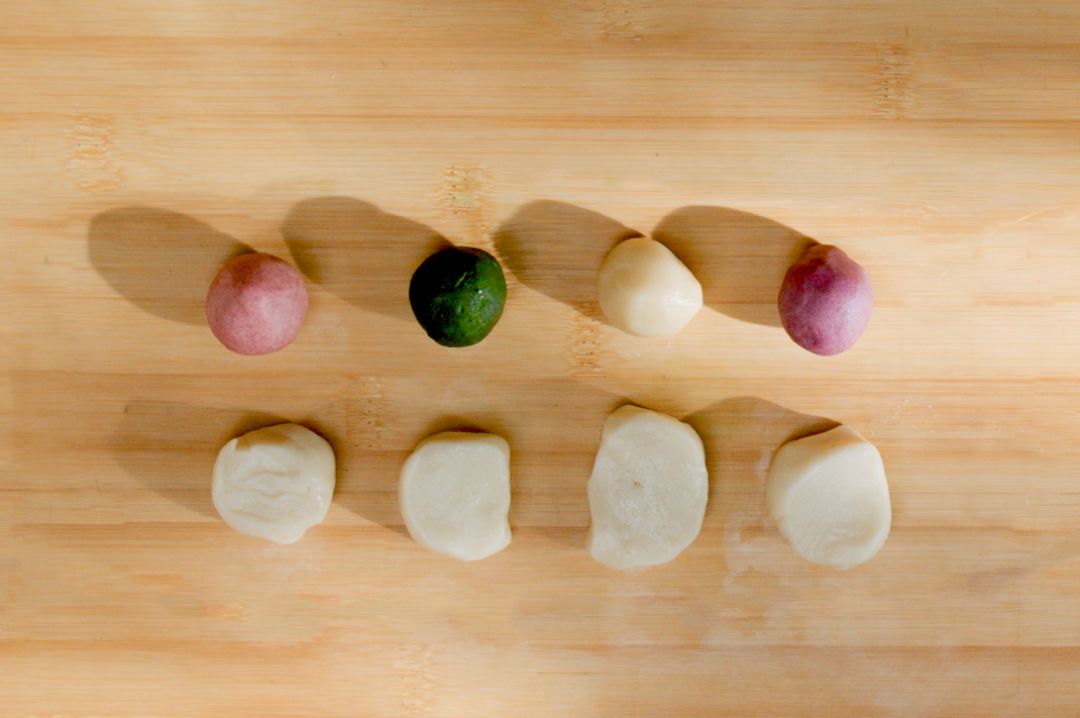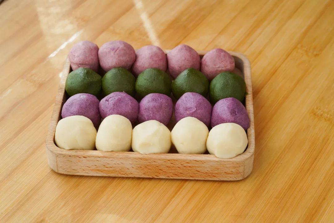 3、将两种馅心,均分为20g一个,搓圆,备用。