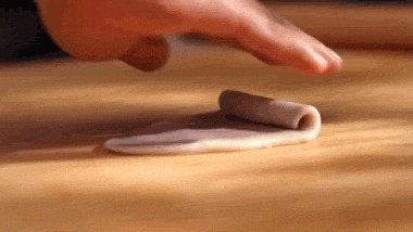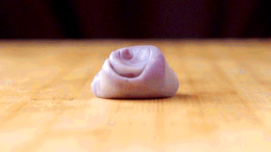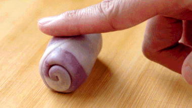 7、卷起松弛2次过后,用食指在中间压一下,将两头向上翻。