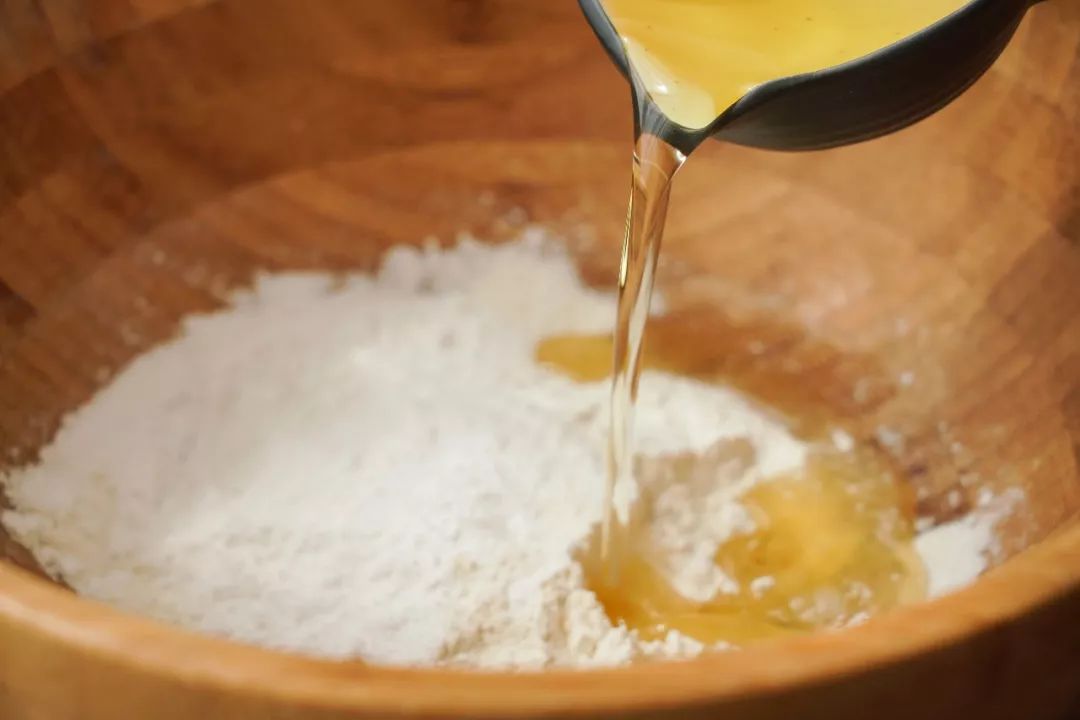 1、水油皮:取一料理碗,放入150g中筋面粉、40g植物油、30g糖粉和80g沸水,搅拌成团后取出,放在撒有少许面粉的操作台上,摔打几下面团,包上保鲜膜,入冰箱冷藏松弛40分钟,备用。
