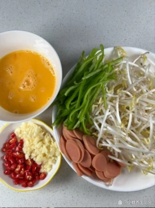 秋天真的要来临了,到了八月之后,我们迎来立秋节气,虽然标志着秋天的到来,但是没有感受到一丝丝凉意,反而是天气越来越闷热,最近很多城市都开始人工降雨,马上新一轮的台风要来临,气温就出现大跳水的情况。现在还处于末伏阶段,虽然不如中伏炎热,但是还是让人不舒服,特别容易中暑,经常会容易出现流汗,身体的钾元素和水分都大量流失,因此一日三餐一定要按时吃。晚餐需要丰盛的美食,今天分享我们家晚餐的一道菜肴——绿豆芽火腿肠炒鸡蛋,这菜成本很低,吃起来不会油腻,对于改善胃口有好处。末伏之后,这三样食材炒着吃,简单美味又营养,天天吃不会腻。