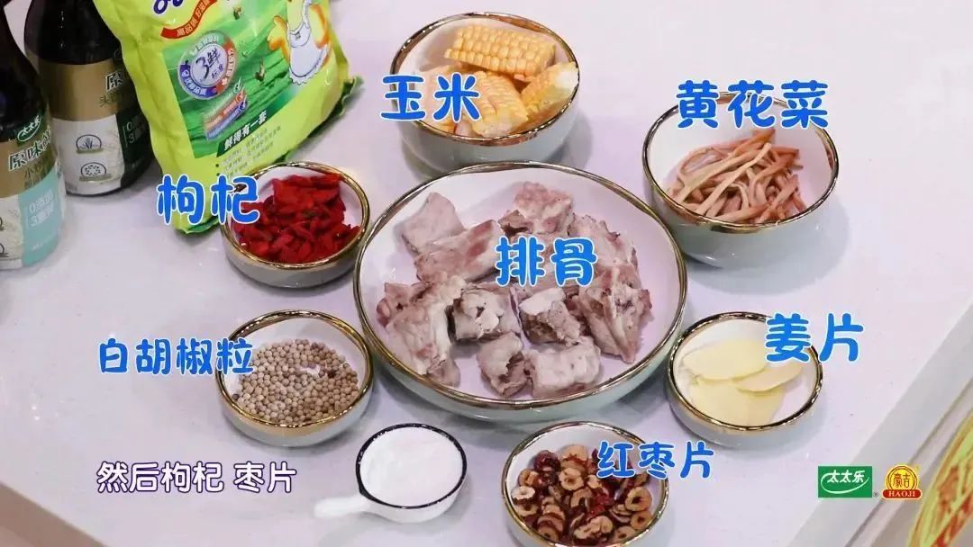 玉米、排骨、姜、白胡椒粒、黄花菜、红枣片、枸杞、盐、鸡精
