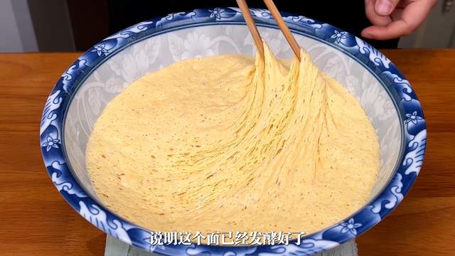 盖上保鲜膜,醒发至原来的两倍大,醒发好的面里满满的都是蜂窝组织,说明这个面已经发酵好了,用筷子搅拌几下,排一下面团里的空气