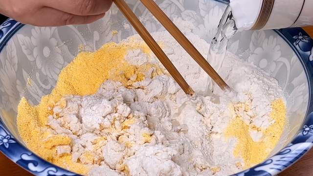 准备一个大碗倒入普通面粉,玉米面粉,酵母,白糖,少量多次倒入温水,边倒边搅拌