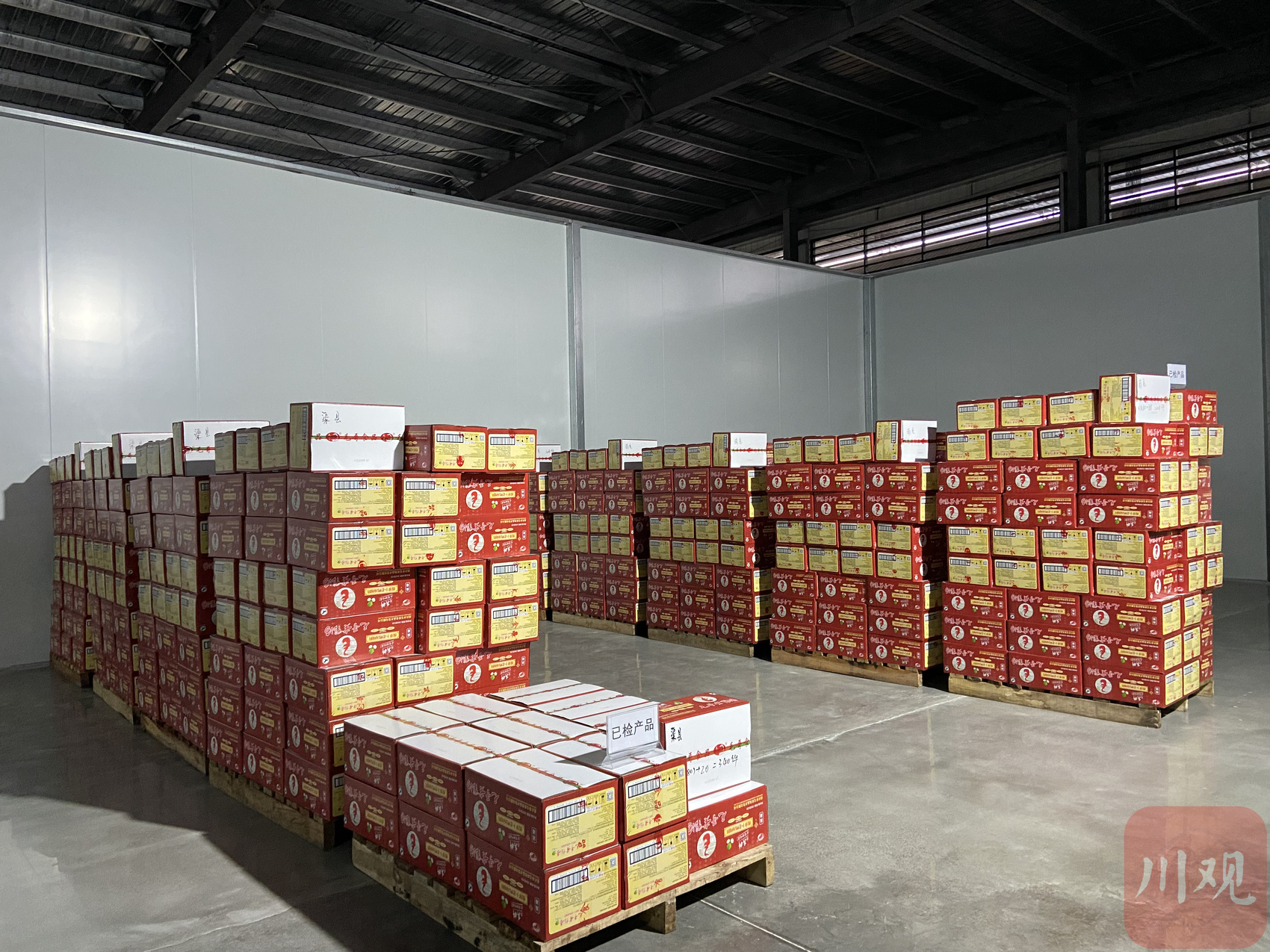 毛哥食品库房内整齐摆放着即将发货的“新春特别版”老鸭汤产品。邓涵予 摄