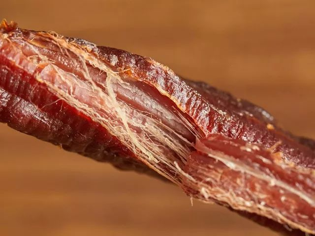 徒手轻轻一撕,牛肉的肌理被拉扯开来,每一丝纤维都能让人感受到牛肉的弹韧,这感觉跟吃炖牛肉有一拼!丝毫找不到一丁点认知中牛肉干该有的干硬,同时咀嚼起来又不失嚼劲!