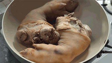 2只猪蹄用喷枪烧去猪毛,清水洗净。冷水放入猪蹄,加入3片姜片,1个葱结,大火烧开后捞出猪蹄洗净备用。