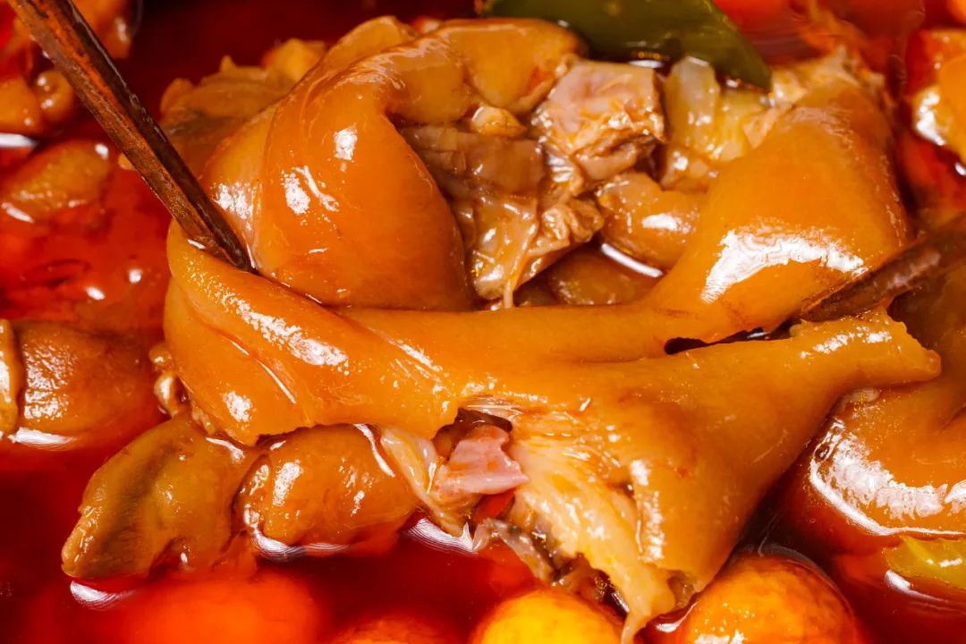 1、锅中倒入半锅热水,放入处理干净的猪蹄、卤料包(见下方黄色标注)、2大勺辣卤油、50g干辣椒段、10g红花椒,淋入3勺生抽、2勺老抽、1勺料酒、20g冰糖、2勺郫县豆瓣酱和1勺食盐,大火煮开转小火,盖盖炖煮约3个半小时至猪蹄软烂。