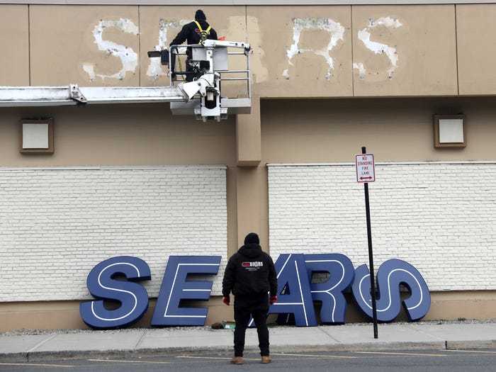 △工人们正将西尔斯百货公司标志从外墙上拆下。图据路透社
