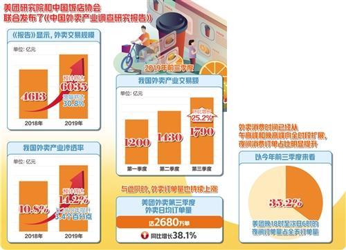 数据显示,2019年前三季度,我国外卖产业交易额分别为1200亿元、1430亿元、1790亿元,第三季度环比增长25.2%。与此同时,外卖订单量也持续上涨。以美团外卖为例,第三季度,美团外卖日均订单量达2680万单,同比增长38.1%。订单量的持续增长表明,外卖在消费中的作用进一步凸显,且外卖市场仍有巨大的增长潜力。