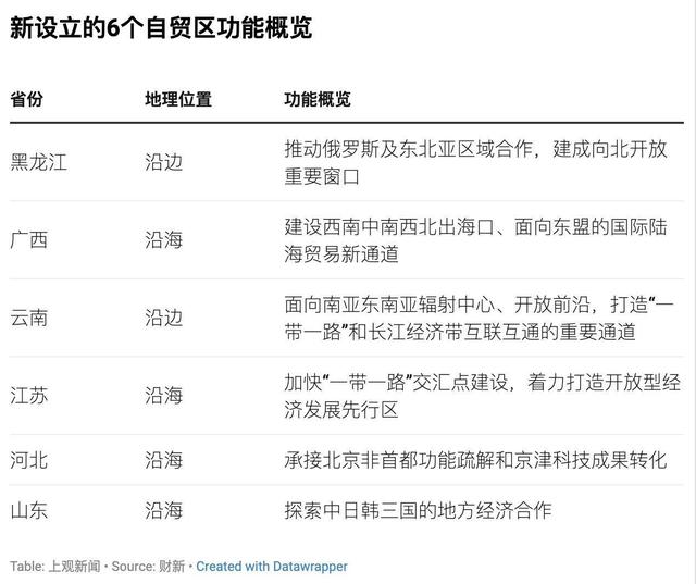 从地图上看,新增的六个自贸区位于中国东西两个呈对角线的角上。北至黑龙江,南到云南省,既有西部省份广西,又有东部的山东和江苏,河北则作为中部大省代表。四个沿海,两个内陆边境省份。从功能上看,河北自贸区主要服务于首都经济圈,江苏则强调了开放型经济发展先行区的地位。其余四个自贸区的主要开放对象,都是各自辐射的周边国家及地区。