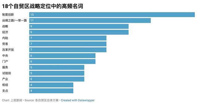 我们将18个自贸区战略定位中的高频词进行分类,发现出现最多的名词是“制度创新”和““一带一路/丝绸之路”,出现最多的形容词是“可复制可推广”。这反映了自贸区的主要目标和发展路径。