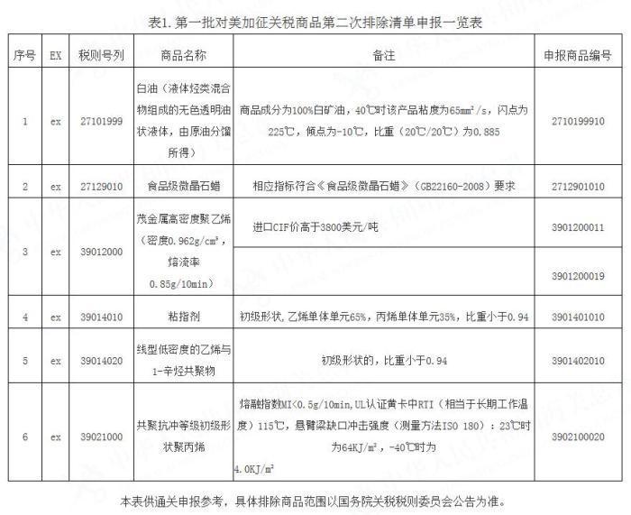 关于第二次排除清单,第一批对美加征关税商品的第二次排除清单涉及6项商品,主要为化工产品。对清单所列商品(为执行此次排除措施而专门拆分的10位海关商品编号),自2019年12月26日至2020年12月25日(1年),不再实施我为反制美301措施所加征的关税,即不再加征自2018年7月6日以来实施的反制美301措施的所有批次加征关税。