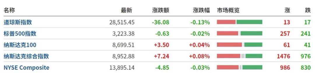 截止收盘,纳指涨0.08%,道指跌0.13%,标普500指数跌0.02%。波音跌1.35%,领跌道指。苹果涨0.1%、特斯拉涨1.44%,均再创历史收盘新高。