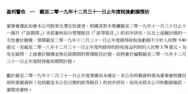 2019年它过得有“多惨”呢?其不久前刚发布的公告显示,预计2019年公司亏损数目将不少于9.8亿元。而根据财报,2018年的除税后溢利约为3.78亿元。