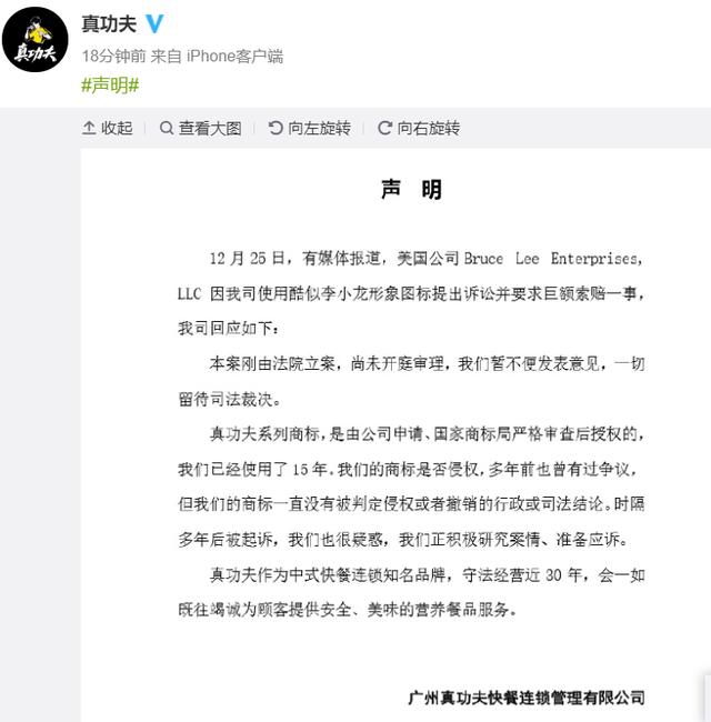 此前有媒体报道,使用酷似李小龙形象图标长达15年的真功夫餐饮,被Bruce Lee Enterprises,LLC(李小龙有限责任公司)诉至上海二中院。26日早间,真功夫官方微博发表声明回应李小龙女儿起诉称,“本案刚由法院立案,尚未开庭审理,我们暂不便发表意见,一切留待司法裁决。”