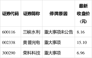 证券时报•数据宝统计,沪深两市共有3只个股今日起开始停牌,其中沪市1只,深市2只。今日起复牌的个股有4只,其中沪市3只,深市1只。详情如下表所示。(数据宝)