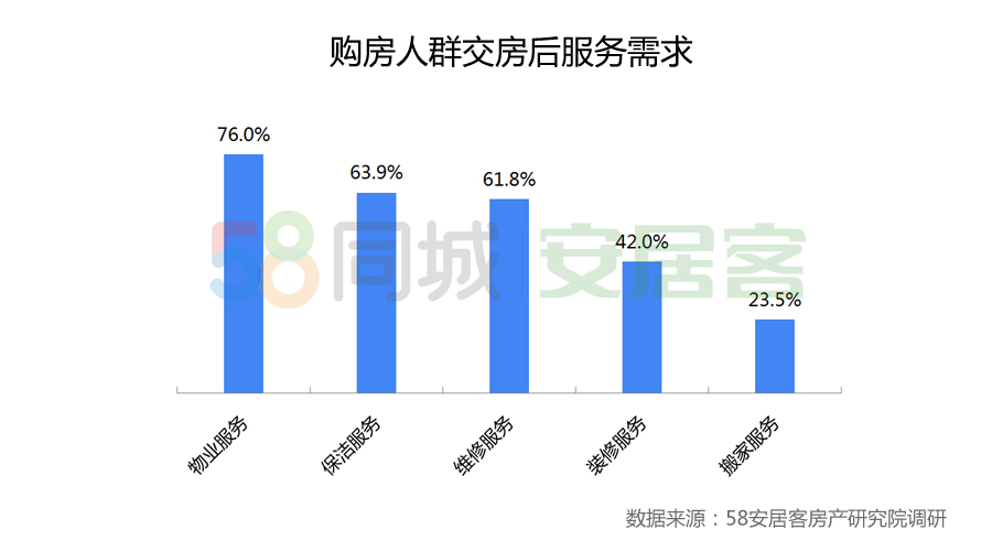 对于小区外部周边配套,学校和医院备受购房者关注。58同城、安居客调研发现,45.6%的用户希望小区周边有学校,希望小区附近有医院的受访者占比为41.5%。便利店、大型超市、公园、菜场等也备受购房者关注,完备的配套设施成为购房的重要参考因素。与此同时,用户对交房后的物业、保洁、维修等服务也很关注,需求占比均超过60%。可见购房不是“一锤子买卖”,较高的物业服务水平,能让购房者拥有更强的幸福感。