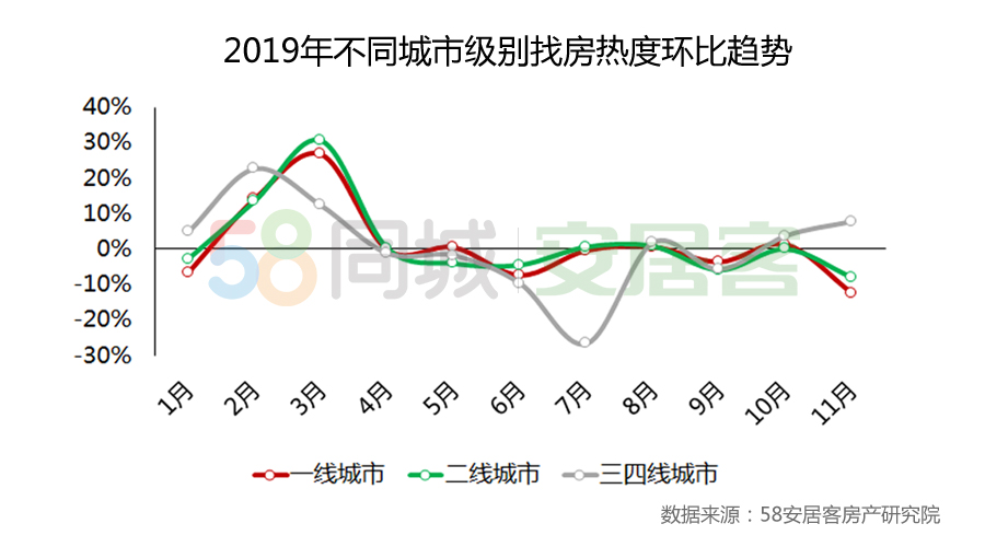 临近春节,返乡置业的人群增多,据58同城、安居客数据显示,每逢春节期间,三四线城市都出现找房热潮。2019年1-2月,三四线城市找房环比热度高于一二线城市,而11月以来,三四线城市找房环比热度再次出现超越一二线的态势,预计12月三四线城市找房将持续升温。