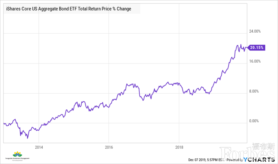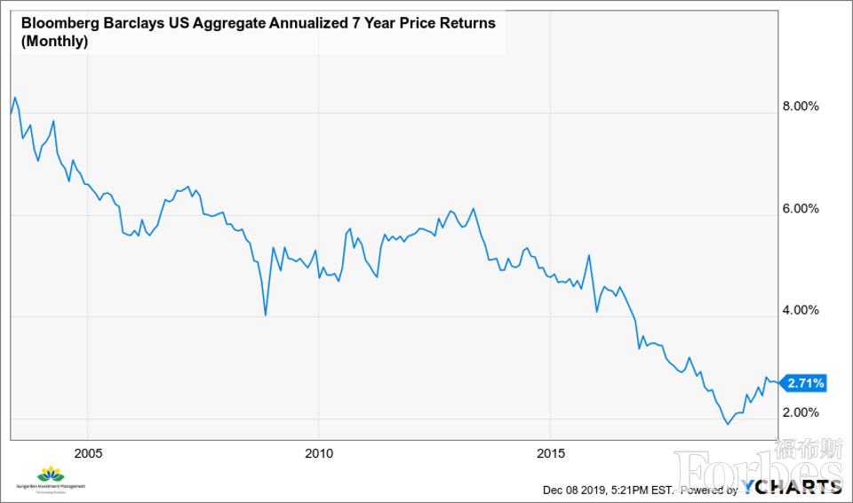 2019年,债券回报率本来还不错。2012年底起算,6年的年回报率不到2%,7年的年回报率则反弹到2.7%。不过,之所以有这种情况,是因为到期利率大跌所致。而利率大跌又使2012年的超低利率水平回归。