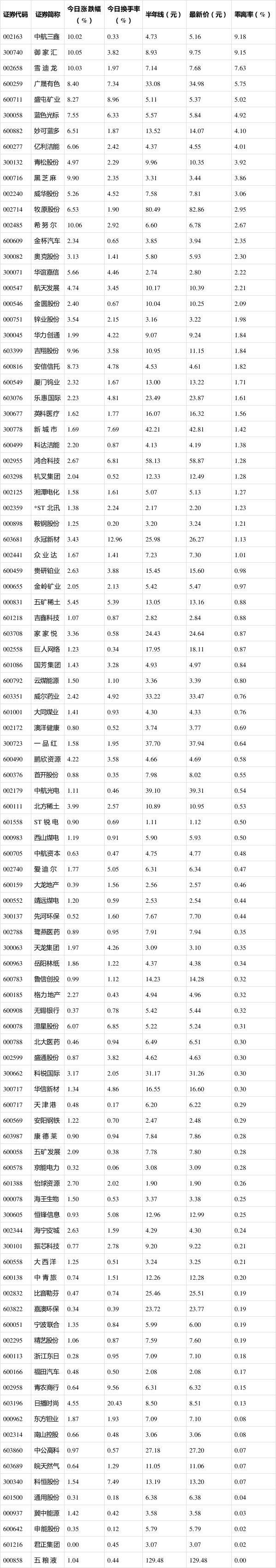 证券时报•数据宝统计,截至今日下午14:00分,上证综指3018.11点,收于半年线之上,涨跌幅0.36%,A股总成交额为4738.46亿元。到目前为止今日有98只A股价格突破了半年线,其中乖离率较大的个股有中航三鑫、御家汇、雪迪龙等,乖离率分别为9.18%、9.15%、7.63%;五粮液、君正集团、申能股份等个股乖离率小,刚刚站上半年线。