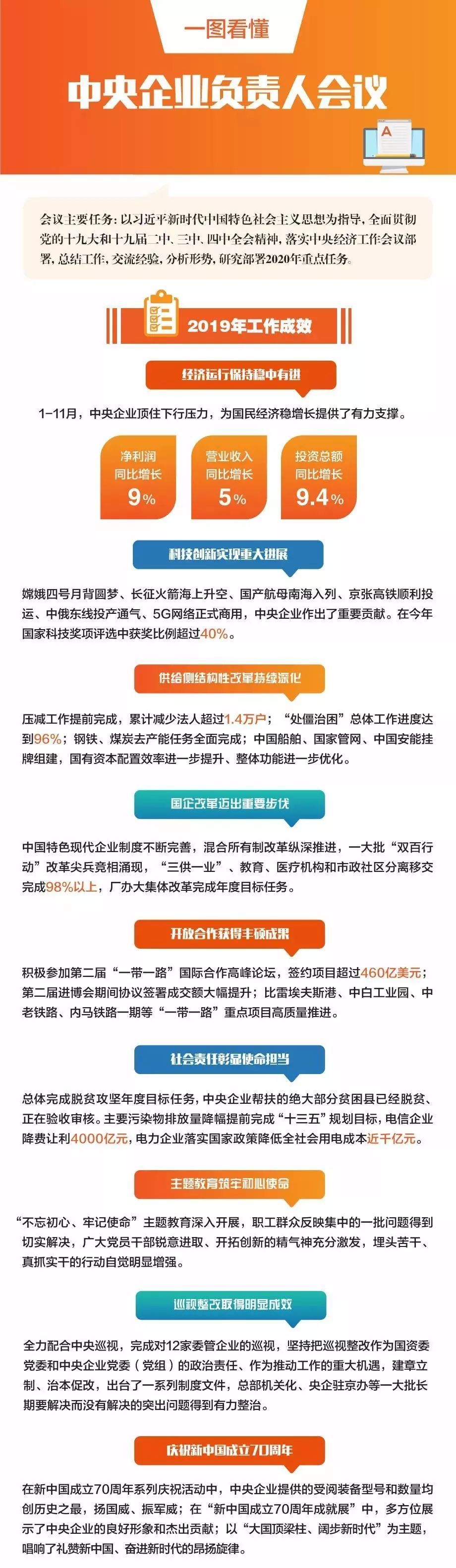 12月24日至25日,国资委在京召开中央企业负责人会议,总结工作,交流经验,研究部署2020年重点任务。今天为您一图解读中央企业负责人会议精神。
