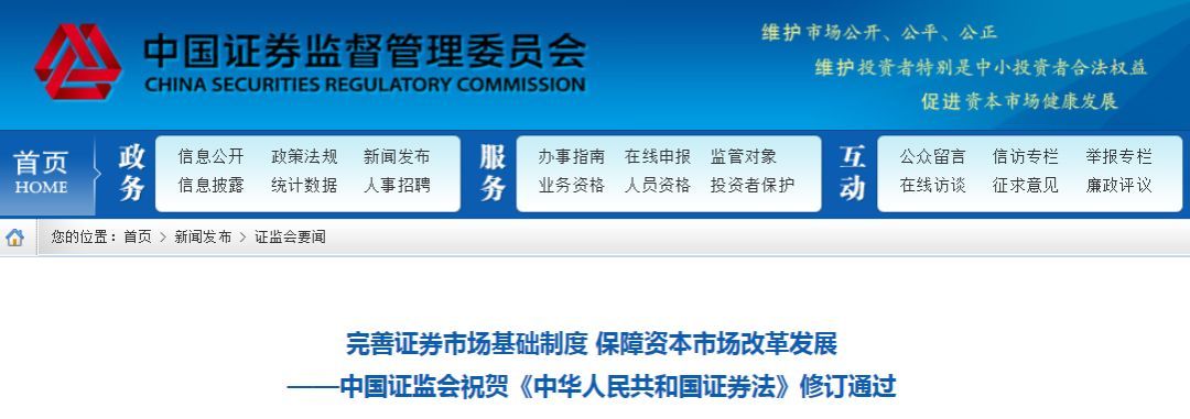 证监会表示,本次证券法修订,按照顶层制度设计要求,进一步完善了证券市场基础制度,体现了市场化、法治化、国际化方向,为证券市场全面深化改革落实落地,有效防控市场风险,提高上市公司质量,切实维护投资者合法权益,促进证券市场服务实体经济功能发挥,打造一个规范、透明、开放、有活力、有韧性的资本市场,提供了坚强的法治保障,具有非常重要而深远的意义。