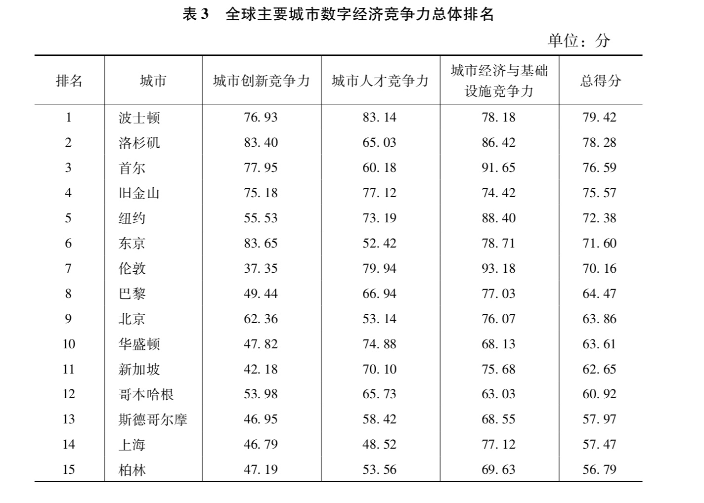 《报告》显示,当前全球城市层面的数字经济竞争力格局为以美国占据绝对优势地位,欧洲发达国家在城市创新竞争力与人才竞争力方面实力雄厚,亚洲新兴经济体国家的城市在经济和基础设施竞争力方面以后来居上为主要特征。