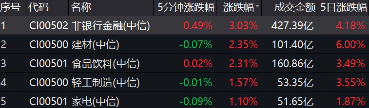 非银金融、建材板块涨幅居前。其中,方正证券、国投资本涨停,中信证券大涨7.42%。