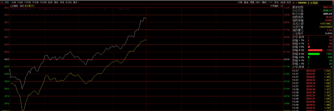 12月30日上午,上证指数先是开盘失守3000点,继而震荡攀升,截至上午收盘,报3033.33点、上涨0.94%。