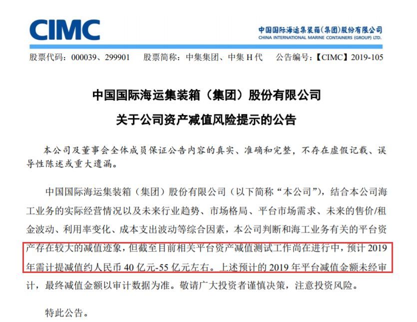 中集集团(000039)今日晚间公告,公司判断和海工业务有关的平台资产存在较大的减值迹象,截至目前相关平台资产减值测试工作尚在进行中,预计2019年需计提减值约40亿元-55亿元。中集集团今年前三季度的净利润为6.36亿元。
