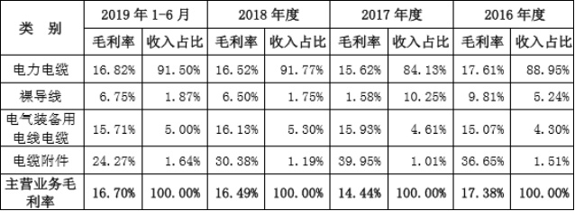 2016年—2018年和2019年1月—6月(下称报告期),中辰电缆分别实现营业收入14.64亿元、19.52亿元、19.02亿元、10.43亿元;对应归母净利润分别为4488.83万元、4863.43万元、8891.65万元、5183.19万元。报告期内,该公司综合毛利率分别为17.38%、14.45%、16.49%和16.70%。