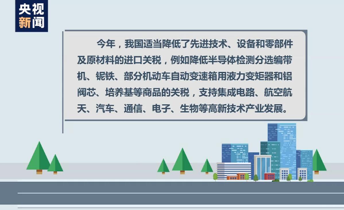 除了日用消费品,今年,我国适当降低了先进技术、设备和零部件及原材料的进口关税,例如降低半导体检测分选编带机、铌铁、部分机动车自动变速箱用液力变矩器和铝阀芯、培养基等商品的关税,支持集成电路、航空航天、汽车、通信、电子、生物等高新技术产业发展。