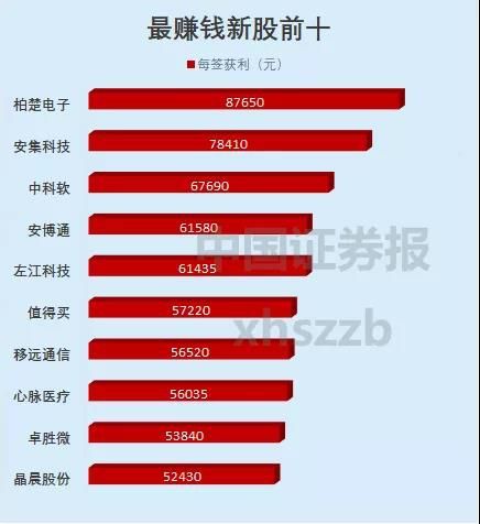 2019年打新最赚钱的10只新股,单签收益都达到了5万元以上,柏楚电子以单签收益87650元成为2019年最赚钱新股。