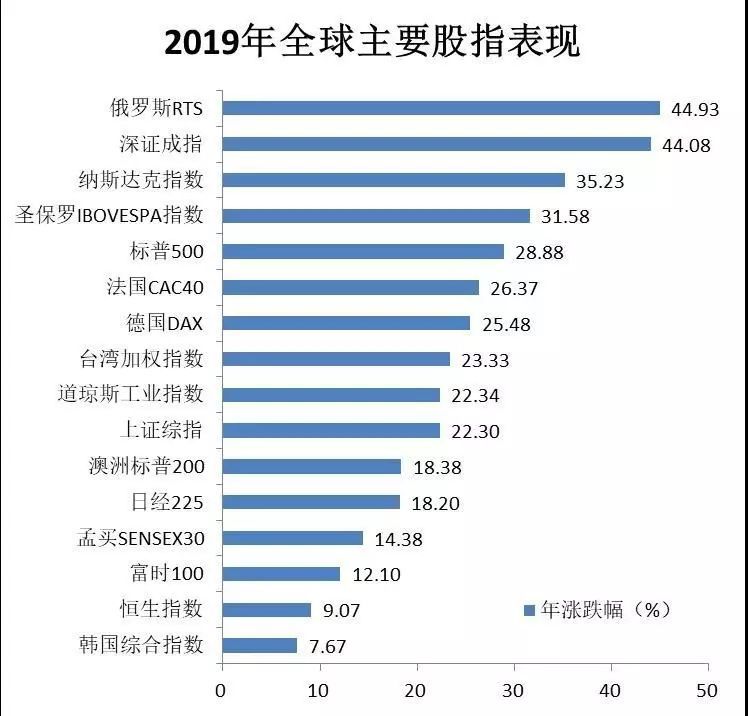 ●据证券时报消息,根据近期德意志银行的计算,2019年全球股市的价值从年初开始不到70万亿美元,到现在已经超过85万亿美元,全球股市总市值增加超过17万亿美元。其中俄罗斯RTS指数夺得涨幅冠军。深证成指涨幅排名第二,纳斯达克指数涨幅排名第三。2019年取得正回报的股票指数有118个,占比近89%。