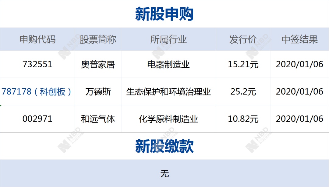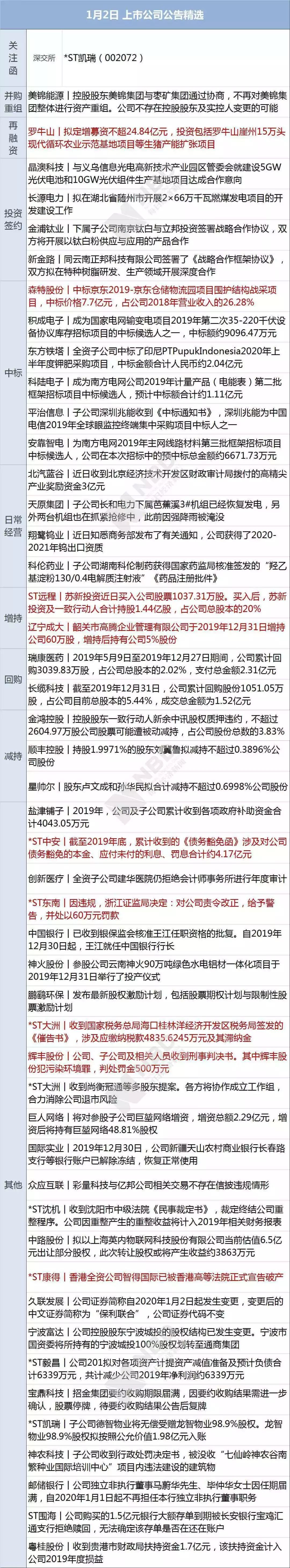 ●据京沪高铁首次公开发行股票网上路演公告,本次拟公开发行股票628563万股,约占发行后公司总股本的12.80%,全部为公开发行新股,不设老股转让。回拨机制启动前,本次发行初始战略配售股份数量为314281.5万股,约占本次发行股份数量的50%,网下初始发行数量为219997.1万股,约占扣除初始战略配售数量后发行数量的70%,网上初始发行数量为94284.4万股,约占扣除初始战略配售数量后发行数量的30%。网上路演时间为2020年1月3日14:00-17:00。●据央视财经消息,近日,深圳市中级人民法院就腾讯起诉畅游云端、英雄互娱等七家公司侵犯著作权一案作出一审判决,认定由英雄互娱发行的手机游戏《全民枪战》6幅游戏地图侵犯网络游戏《穿越火线》游戏地图著作权,裁定七被告共同赔偿腾讯公司经济损失与合理维权费用超4524万元。●神农科技1日公告披露,海南保亭南繁种业高技术产业基地有限公司因违规,保亭黎族苗族自治县综合行政执法局决定:没收“七仙岭神农谷南繁种业国际培训中心”项目内违法建设的57栋建(构)筑物,总占地面积9,586.64平方米,总建筑面积11,798.14平方米的行政处罚。若南繁种业最终被处罚,预计将减少公司2019年净利润约为10,798.26万元。●ST围海1日公告,公司财金部员工于2019年12月31日下午到长安银行股份有限公司宝鸡汇通支行办理赎回大额存单的业务时,被宝鸡支行工作人员口头拒绝办理,导致公司募集资金购买的15,000万元大额单位定期存单无法赎回。截止报告日,公司无法确定该笔15,000万元大额单位定期存单是否在还在账户,也暂时无法查询账户余额是否被划转。●新京报消息,实名举报酒鬼酒产品含有甜蜜素的原酒鬼酒经销商石磊1日表示,湘西土家族苗族自治州市场监管局此前对自己的投诉不予受理,有60天申请复议时间,决定近期暂不申请复议,将先与相关部门进行沟通。●万达集团官网1日发表声明称,由于种种原因,万达至今没有获得一方足球俱乐部股权,俱乐部历史遗留的问题也没有得到解决,甚至连俱乐部账户都无法使用。在这种情况下,万达集团不能以目前的方式继续支持一方足球俱乐部。万达在大连建设了世界一流的足球基础设施,中国一流的青少年足球队伍,也有长期支持大连校园足球的承诺,因此万达不会退出大连足球,将寻求自己重建职业俱乐部,继续支持大连足球。