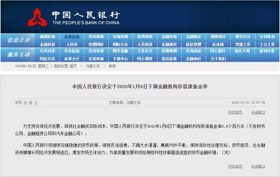 中国人民银行1月1日公告称,为支持实体经济发展,降低社会融资实际成本,决定于2020年1月6日下调金融机构存款准备金率0.5个百分点(不含财务公司、金融租赁公司和汽车金融公司)。