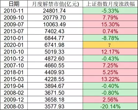 在解禁市值比2020年1月份大的其他月份,上证指数更是“三胜二负”,解禁当月上涨概率为60%。