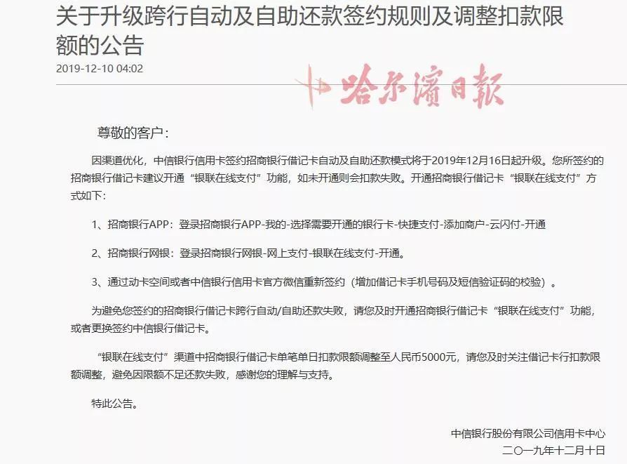 中信银行信用卡中心上个月发出公告称,该行信用卡签约招商银行借记卡自动及自助还款模式将于当月16日起升级。客户所签约的招商银行借记卡建议开通“银联在线支付”功能,如未开通则会扣款失败。且“银联在线支付”渠道中招商银行借记卡单笔单日扣款限额调整至人民币5000元。